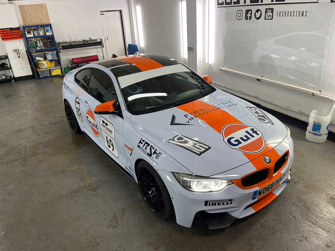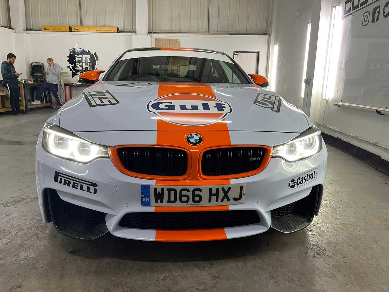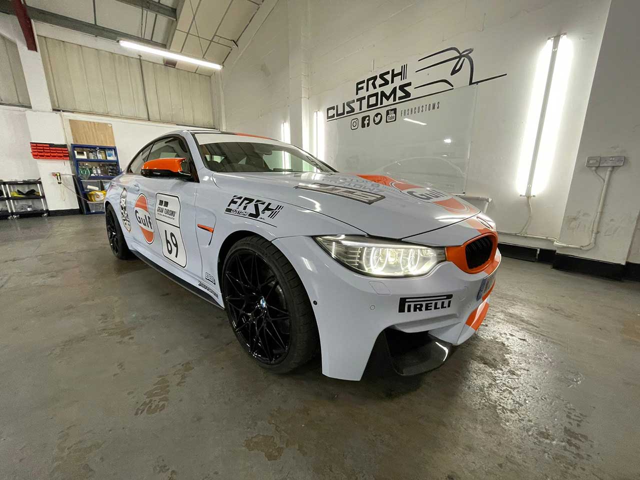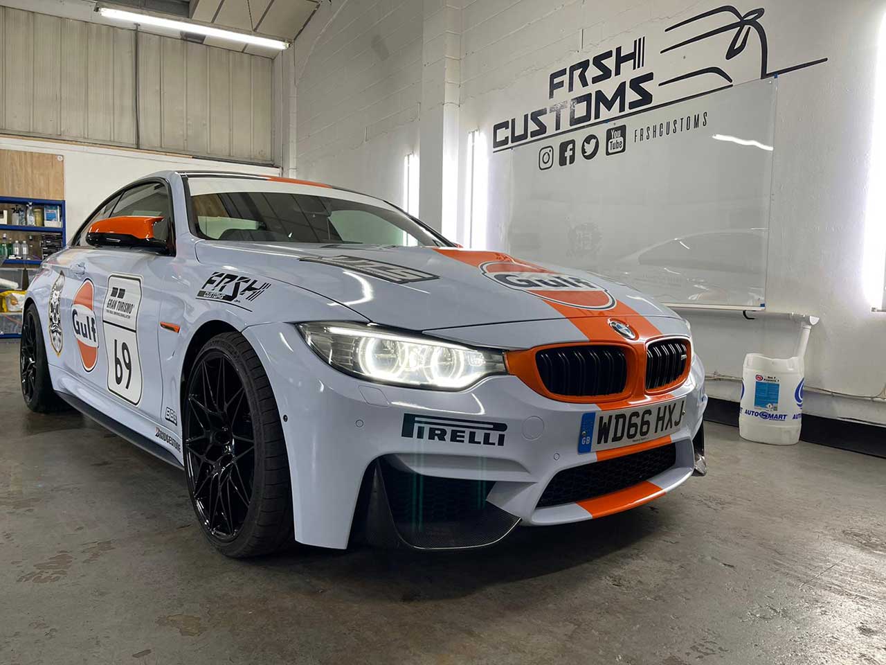 This BMW M4 was given a full custom tour wrap by our team at FRSH Customs in Kent. Featuring the iconic Gulf racing colours and detailed sponsor decals, this wrap creates a bold, race-inspired look while also protecting the vehicle’s paintwork. Perfect for events, shows, or track days, our tour wraps are designed to stand out and showcase your brand in style.