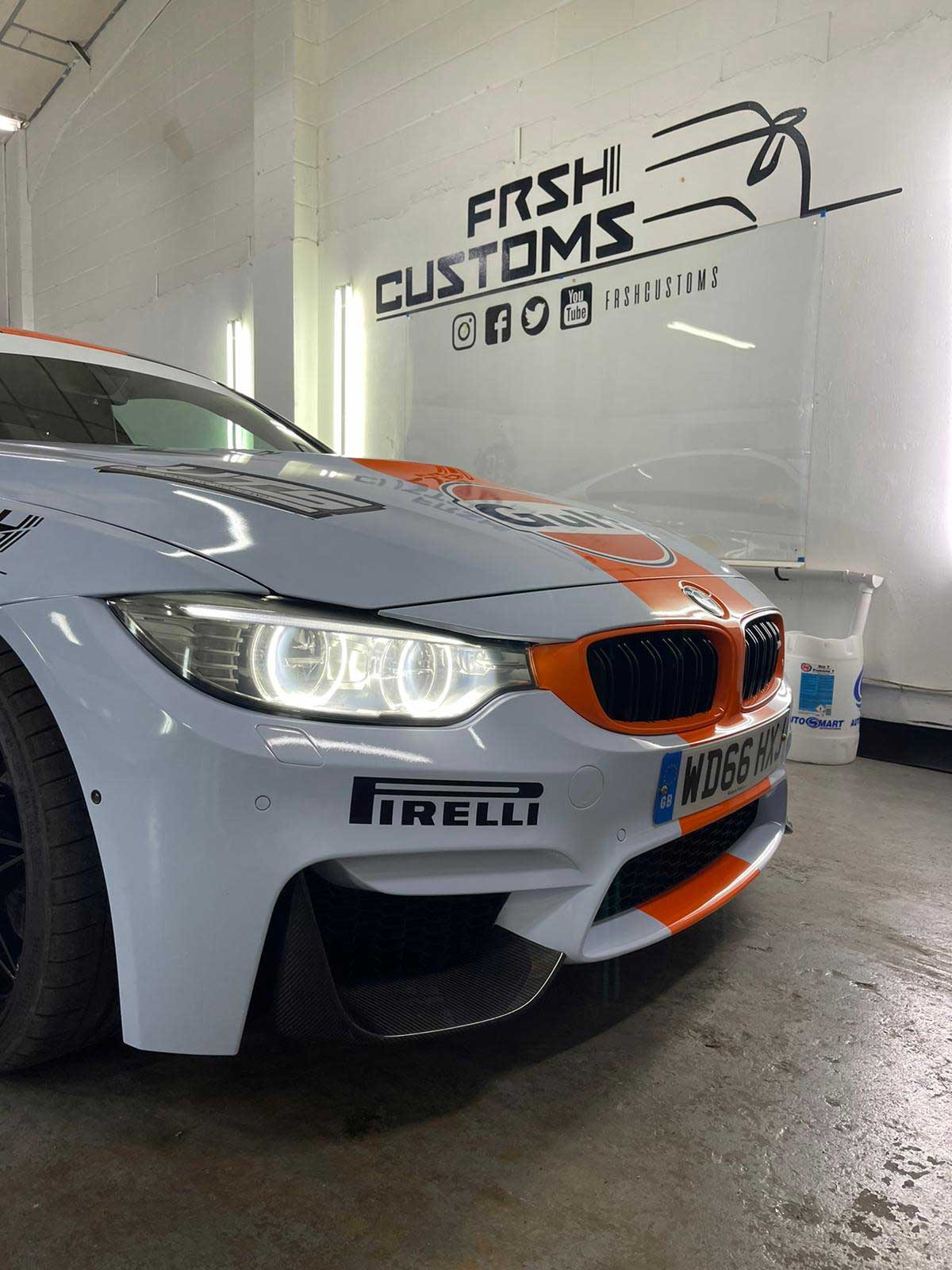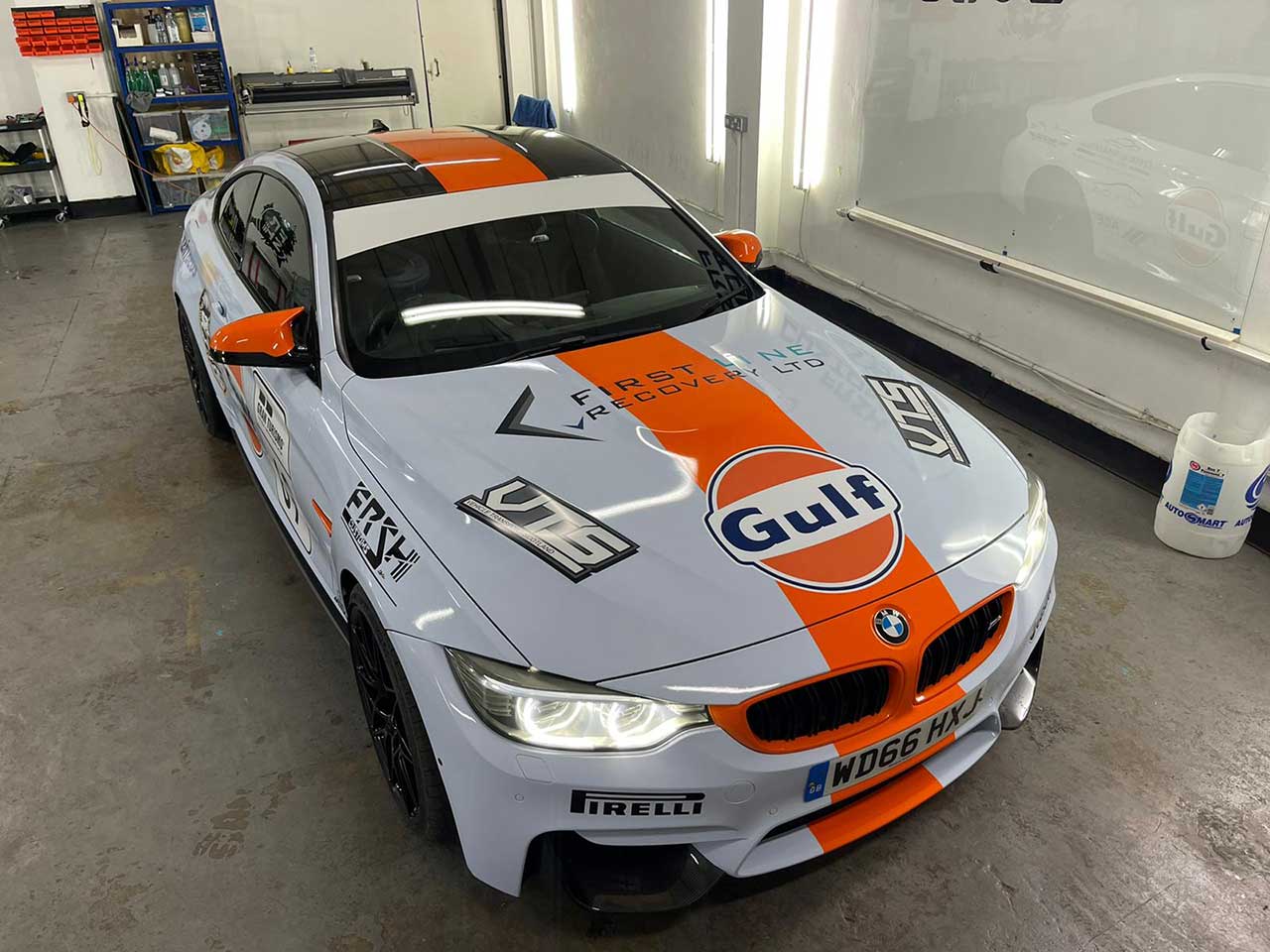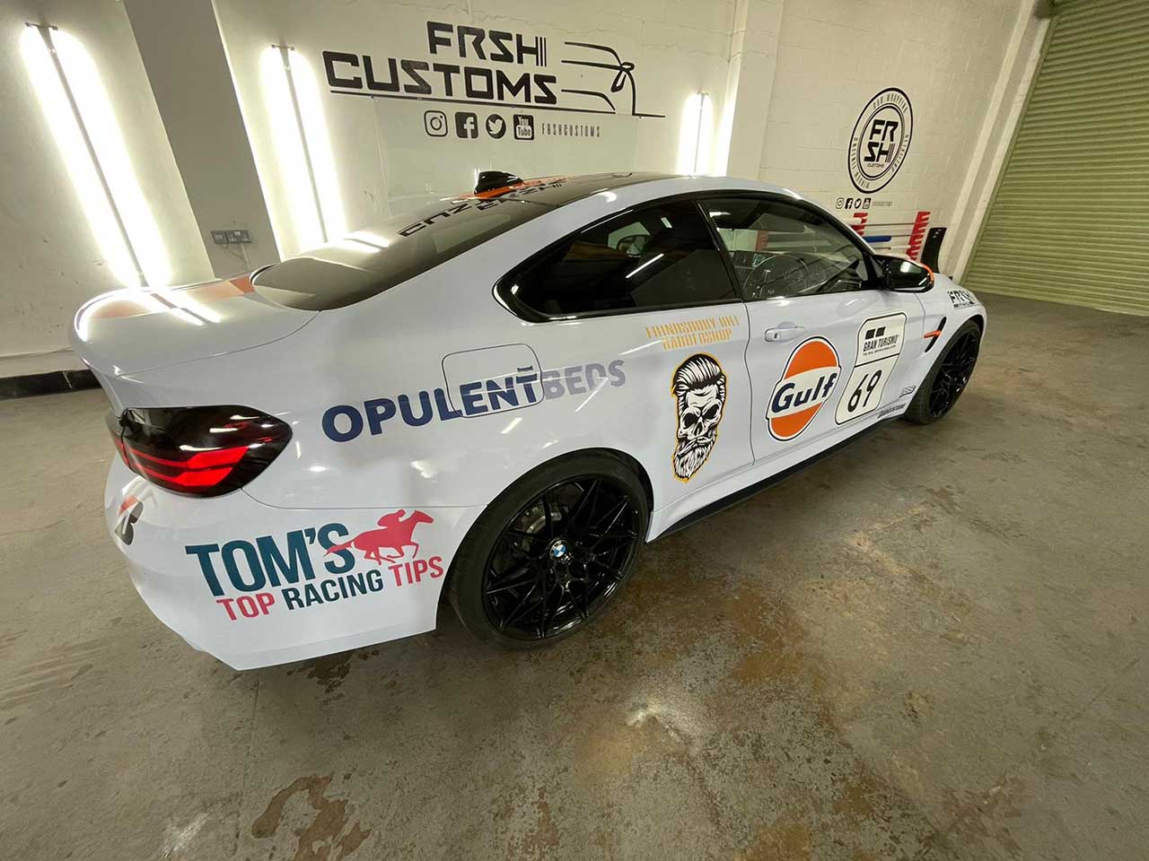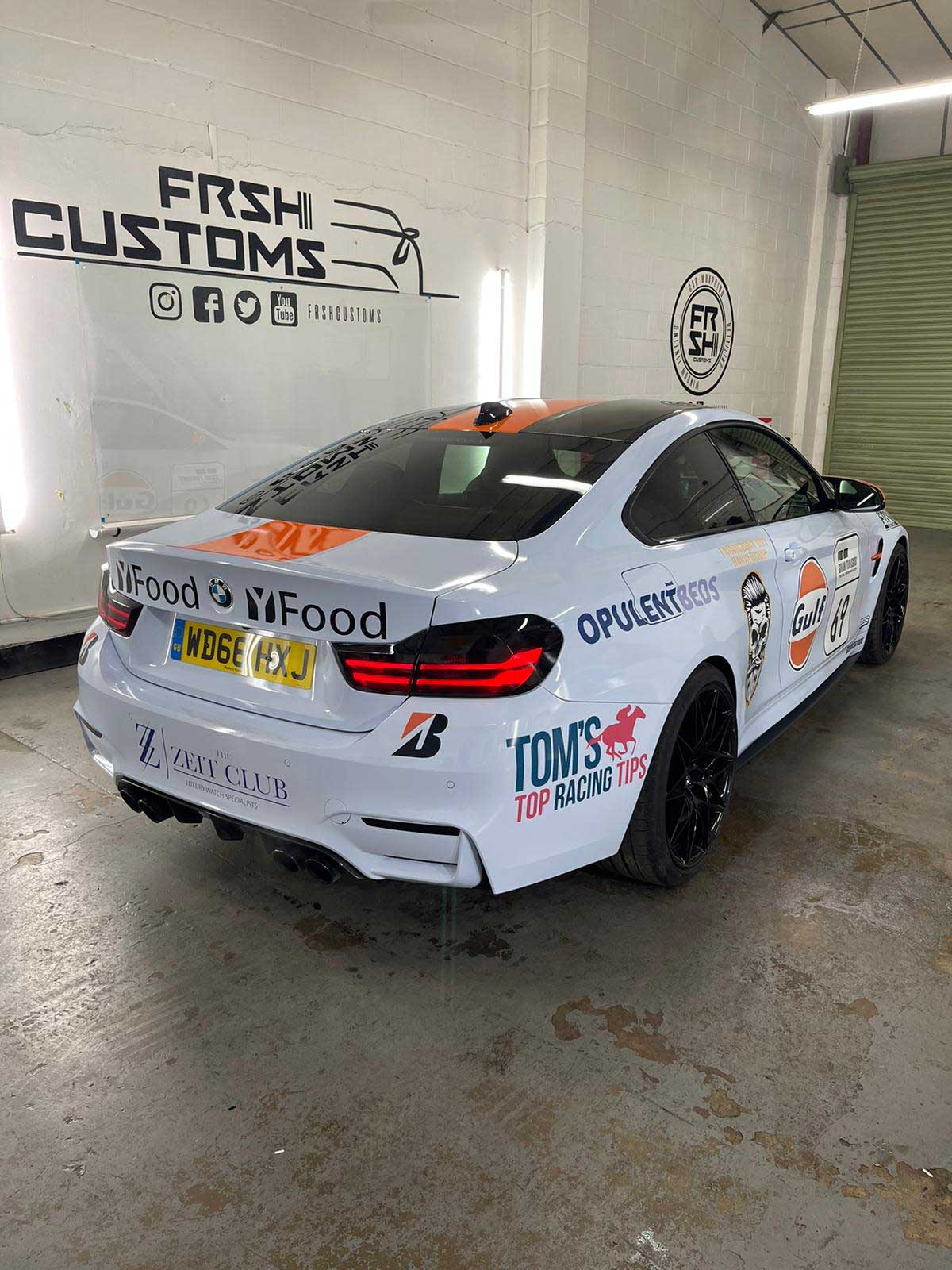 This BMW M4 was given a full custom tour wrap by our team at FRSH Customs in Kent. Featuring the iconic Gulf racing colours and detailed sponsor decals, this wrap creates a bold, race-inspired look while also protecting the vehicle’s paintwork. Perfect for events, shows, or track days, our tour wraps are designed to stand out and showcase your brand in style.